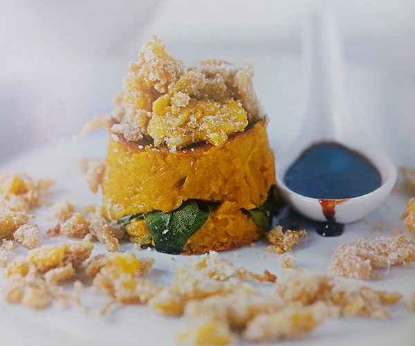 Tortinhas de abóbora com espinafre e farofa de ovo